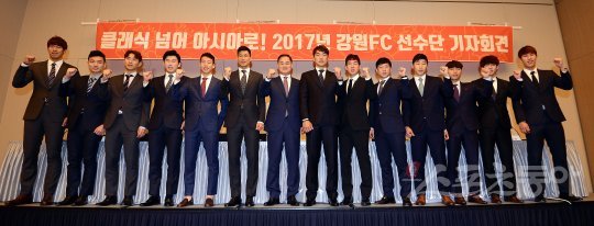 5일 강원도 강릉씨마크호텔에서 열린 2017 강원FC 선수단 기자회견을 마치고 최윤겸 감독과 선수들이 화이팅을 외치고 있다.