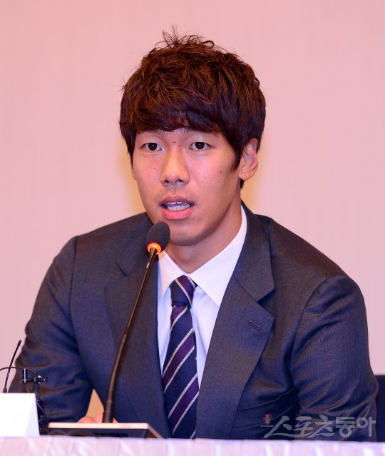 5일 강원도 강릉씨마크호텔에서 열린 2017 강원FC 선수단 기자회견에서 이범영이 취재진의 질문에 대답하고 있다.