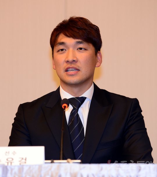 5일 강원도 강릉씨마크호텔에서 열린 2017 강원FC 선수단 기자회견에서 송유걸이 취재진의 질문에 대답하고 있다.
