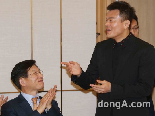 가수 박진영이 5일 오후 서울 마포구 상암동 KBS미디어센터에서 열린 '2017 KCBL 연예인 농구리그' 업무협약 체결식에서 참석해 인사를 하고 있다.