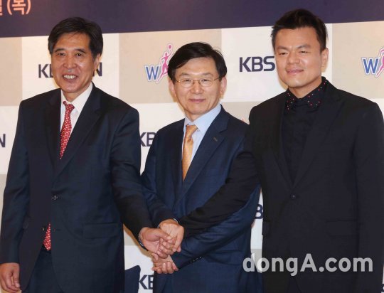 5일 오후 서울 마포구 상암동 KBS미디어센터에서 열린 '2017 KCBL 연예인 농구리그' 업무협약 체결식에서 신선우 WKBL 총재, 이준용 KBS N 대표, 박진영 JYP 대표가 참석해 손을 맞잡고 있다.