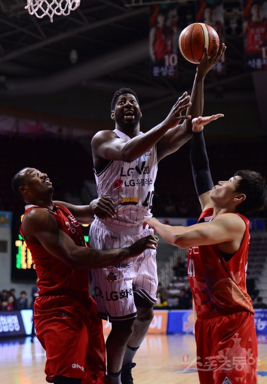7일 안양실내체육관에서 ‘2016~2017 KCC 프로농구’ KGC인삼공사와 LG세이커스의 경기가 열렸다. LG세이커스 메이스가 안양KGC 사이먼과 오세근(오른쪽)의 마크를 뚫고 골밑 공격을 하고 있다.
