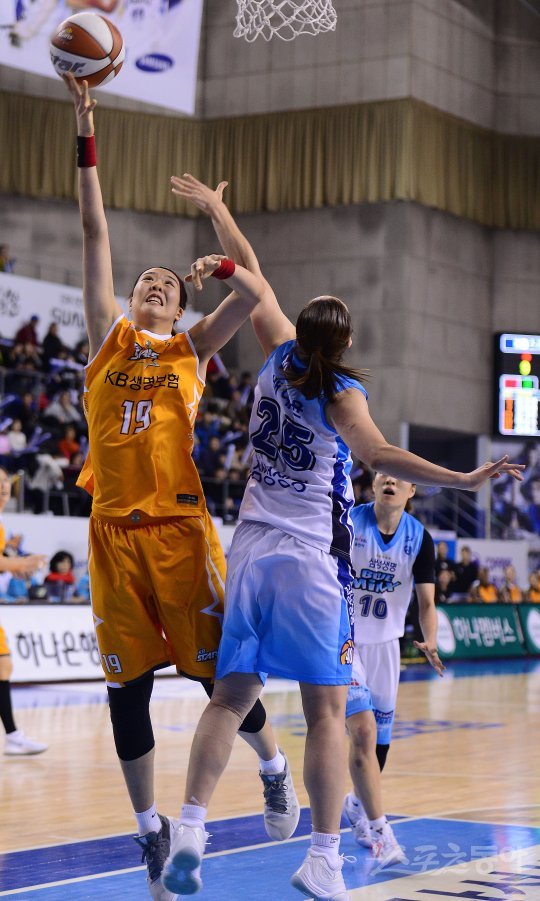 9일 경기도 용인실내체육관에서 ‘삼성생명 2016-2017 여자프로농구’ 용인 삼성생명과 청주 KB스타즈의 경기가 열렸다. KB스타즈 박지수가 삼성생명 배혜윤의 마크를 피해 레이업 슛을 하고 있다.
