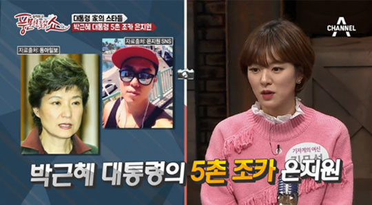 이에 또 다른 기자는 “지난 2011년 9월, 박근혜 대통령이 자신의 트위터에 ‘조카 지원이와 함께 한 컷’이라는 글과 함께 사진을 올린 적이 있었다. 두 사람이 활짝 웃고 있는 모습이 세간의 이목을 끌었었는데, 당시 은지원은 사진이 화제가 되자 박근혜 대통령을 ‘나보다 더 연예인 같은 고모다’라고 이야길 했다”고 덧붙이기도 했다.