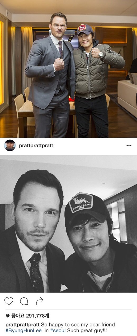 2017년 첫 번째 SF휴먼블록버스터 ‘패신저스’에서 열연을 펼친 크리스 프랫이 지난 내한 당시 배우 이병헌을 개인적으로 만난 사실이 알려졌다. 이병헌 측은 영화 ‘패신저스’에 출연한 크리스 프랫을 향해 응원도 잊지 않았다.