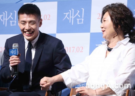 배우 강하늘(왼쪽)과 김해숙이 10일 오전 서울 강남구 압구정 한 멀티플렉스관에서 열린 영화 '재심' 제작보고회에 참석하고 있다.