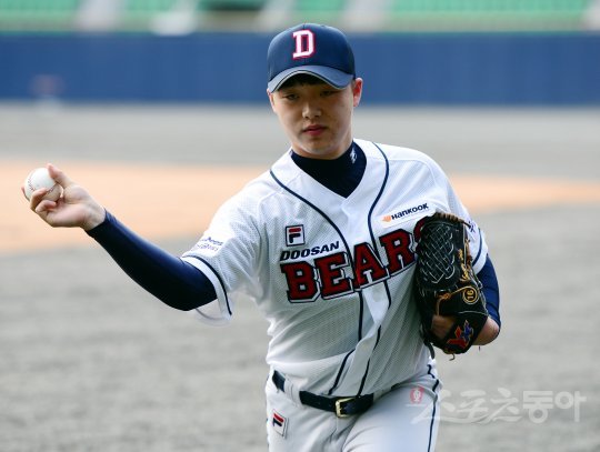 10일 서울 잠실야구장에서 열린 두산 포토데이에 참석한 박치국이 카메라를 향해 포즈를 취하고 있다. 박치국은 두산의 2차 1순위에 지명되어 1억 3천에 계약했다.