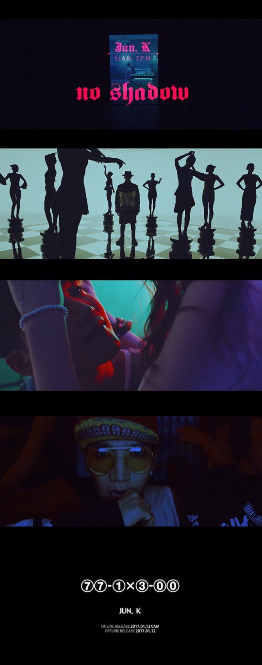영상 속 Jun. K 는 절제된 퍼포먼스와 함께 체스판 위에서 고뇌하는 듯한 모습이다. 보일 듯 말 듯 한 탄탄한 상반신 근육과 화려한 클럽 속에서 등장하는 Jun. K 의 모습은 ’NO SHADOW’ 에 대한 궁금증을 높인다.