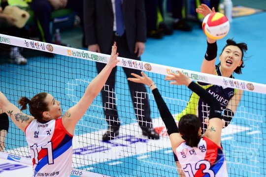 10일 수원실내체육관에서 ‘2016-2017 NH농협 V리그’ 수원 현대건설과 김천 도로공사의 경기가 열렸다. 현대건설 양효진이 도로공사 블로커를 피해 스파이크를 날리고 있다.