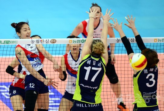 10일 수원실내체육관에서 ‘2016-2017 NH농협 V리그’ 수원 현대건설과 김천 도로공사의 경기가 열렸다. 도로공사 문정원이 도로공사 블로커를 피해 스파이크를 날리고 있다.