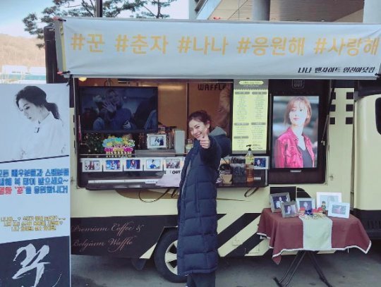나나는 11일 자신의 인스타그램에 “항상 날 기다려주고 응원해주고 사랑해주고 아껴주고 믿어주고.. 너무나 감사하고 또 미안해요. 이 감사함 소중하게 간직 할게요 앞으로 좋은 모습으로 보답 할게요 더 노력하고 열심히 하겠습니다 사랑해요 나의 소중한 팬분들. #꾼 #영화촬영 #나나 #커피차 #춘자 #사랑해 같이 가요 우리❤”라는 글과 함께 사진을 게재했다.