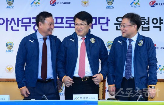 11일 서울 신문로 축구회관에서 아산 무궁화 프로축구단 운영협약식이 열렸다. 허정무 한국프로축구연맹 부총재와 복기왕 아산시장, 서범수 경찰대학장(왼쪽부터)이 무궁화프로축구단 자켓을 입으며 환하게 웃고 있다. 아산 무궁화 프로축구단은 안산시에 안산 그리너스FC가 들어서며 해체, 충청남도 아산시와 새로운 연고 협약을 맺고 아산시를 새 연고지로 창단되었다.