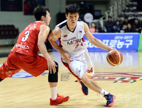 11일 경기도 안양실내체육관에서 열린 ‘2016-2017 KCC 프로농구’ 안양 KGC인삼공사와 울산 모비스의 경기에서 모비스 김효범이 KGC인삼공사 이정현의 수비를 제치며 돌파하고 있다.
