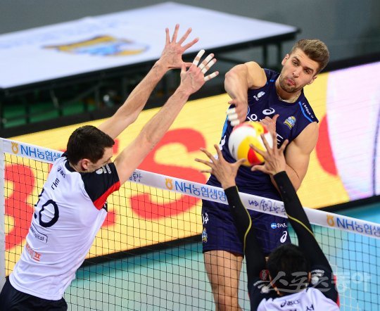 11일 서울 장충체육관에서 ‘2016-2017 NH농협 V리그 남자부’ 우리카드와 현대캐피탈의 경기가 열렸다. 우리카드 파다르가 현대캐피탈 블로커의 수비를 앞에 두고 스파이크 공격을 하고 있다.