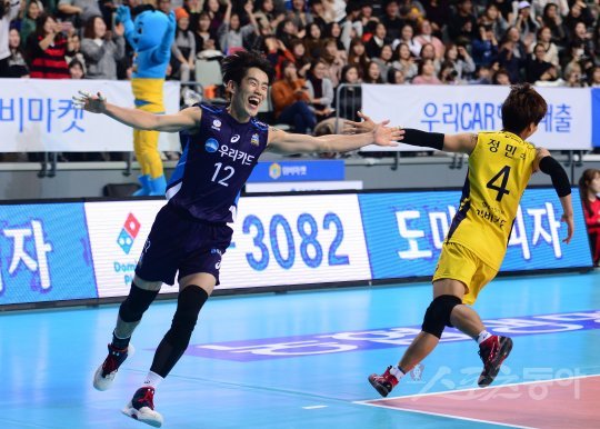 11일 서울 장충체육관에서 열린 ‘2016-2017 NH농협 V리그 남자부’ 우리카드와 현대캐피탈의 경기에서 우리카드가 현대캐피탈에 세트 스코어 3-0 승리를 거뒀다. 3세트 현대캐피탈 문성민의 스파이크 공격이 아웃 판정으로 경기가 끝나자 우리카드 신으뜸이 환호하고 있다.