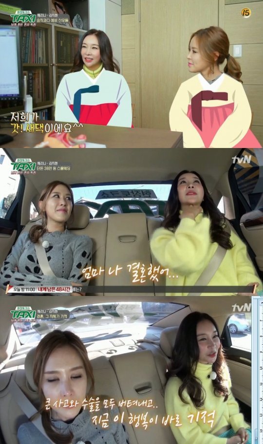 11일 오후 방송된 tvN 예능프로그램 ‘현장토크쇼 택시’(이하 ‘택시)에서는 이제 갓 새댁이 된 채리나와 김지현이 등장해 그간의 사건들과 관련된 이야기 뿐만 아니라 솔직한 입담을 과시하는 장면이 그려졌다.