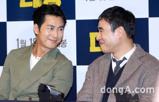 배우 정우성(왼쪽), 배성우가 12일 오후 서울 광진구 건대입구 롯데시네마에서 열린 영화 '더 킹' 언론시사회에 참석해 기자간담회를 하고 있다.