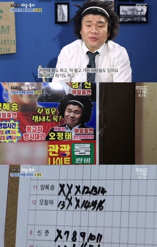 이어 오정태는 "(야간업소에) 매일 출근하고 있다. 술 마시고 날 때리고 끌고 가고 뭔가를 던지는 사람들도 있다"고 힘든 점을 밝혀 안타까움을 자아냈다.