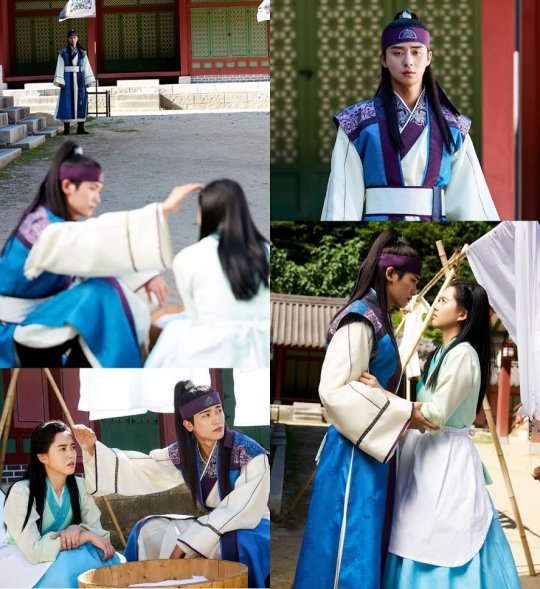 공개된 사진은 ‘화랑’의 9회 한 장면을 포착한 것이다. 사진 속 아로는 빨래를 널고 있다. 삼맥종은 언제나 그렇듯 아로에게 한 발자국 성큼 다가서려는 모습. 아로의 양팔을 붙잡아 자신의 곁으로 끌어 당기거나, 앉아 있는 아로의 얼굴이 햇빛에 그을릴까 손으로 가리개를 만들어 주고 있는 것이다. 그런 삼맥종의 직진 사랑에 아로는 이번에도 당황한 듯한 표정을 짓고 있다.