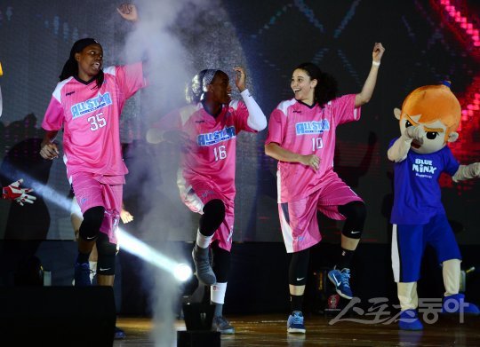 15일 경기도 용인실내체육관에서 ‘삼성생명 2016-2017 여자프로농구 올스타전’ 핑크스타(우리은행, KDB생명, KEB하나은행)와 블루스타(삼성생명, 신한은행, KB스타즈)의 경기가 열렸다. 존스(왼쪽부터), 쏜튼, 어천와가 선수소개에서 화려한 댄스실력을 뽐내고 있다.