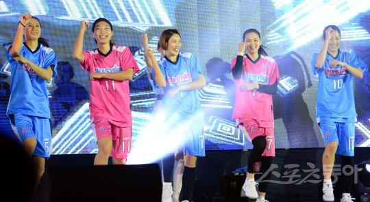 15일 경기도 용인실내체육관에서 ‘삼성생명 2016-2017 여자프로농구 올스타전’ 핑크스타(우리은행, KDB생명, KEB하나은행)와 블루스타(삼성생명, 신한은행, KB스타즈)의 경기가 열렸다. 김연주(왼쪽부터), 임영희, 박하나, 한채진, 고아라가 선수소개에서 화려한 댄스실력을 뽐내고 있다.