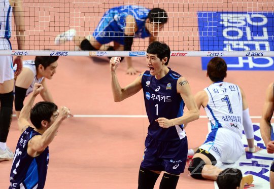 15일 서울 장충체육관에서 열린 ‘NH농협 2016~2017 V리그’ 남자부 삼성화재와 우리카드 경기에서 우리카드 박진우가 공격 득점에 성공한 후 환호하고 있다.