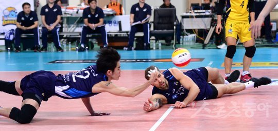 15일 서울 장충체육관에서 열린 ‘NH농협 2016~2017 V리그’ 남자부 삼성화재와 우리카드 경기에서 우리카드 파다르와 신으뜸이 몸을 날려 리시브 하고 있다.