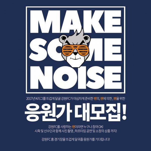 강원FC는 16일부터 ‘2017 강원FC 공식 응원가 및 가사’를 모집한다. 강원FC는 K리그 클래식 승격과 함께 ACL을 목표로 비상을 준비하는 선수단을 위한 새로운 응원곡을 찾는다. 강원FC를 사랑하는 팬이라면 누구나 응모가 가능하다.