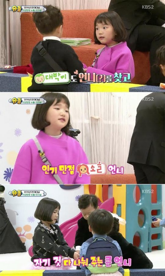한편 이 날 무대 뒤는 장난감을 두고 벌이는 아이들의 눈치 싸움도 만만치 않았다는 후문. 누구나 갖고 싶지만 장난감은 한정되어 있었기 때문이다. 이에 서언이도 수아도 대박이도 모두가 장난감을 원하며 눈물까지 글썽이는 사태가 벌어지자 소을이는 자신의 장난감을 동생들에게 양보하며 사태를 수습하기 시작했다. 소을 역시 장난감을 갖고 싶었지만 스스로 "누나니깐 양보해야지"라며 선뜻 자신의 것을 내어주는 모습을 보여 역시 국민 누나라는 명성을 확인케 했다.