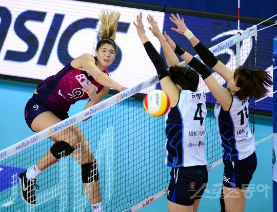17일 인천 계양체육관에서 ‘2016-2017 NH농협 V리그’ 인천 흥국생명과 화성 IBK기업은행의 경기가 열렸다. 흥국생명 러브가 IBK기업은행 블로커를 피해 스파이크를 날리고 있다.