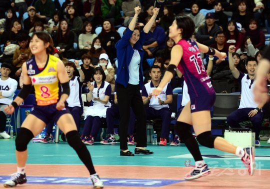 17일 인천 계양체육관에서 ‘2016-2017 NH농협 V리그’ 인천 흥국생명과 화성 IBK기업은행의 경기가 열렸다. 흥국생명 박미희 감독이 선수들의 플레이에 환호하고 있다.