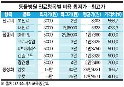 17일 소비자교육중앙회 자료에 따르면, 예방접종의 경우 품목별 가격차 비율이 최대 7배에 이르고 동물병원 진료비 차이는 최대 5배에 달하는 것으로 조사됐다. 같은 치료를 받아도 병원에 따라 가격 차이가 극심한 것이다.