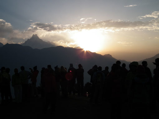 히말라야 푼힐 전망대(3193m)에서 바라본 마차푸차레 너머의 일출. 푼힐 전망대는 마차푸차레를 비롯해 안나푸르나, 다울라기리, 투쿠체, 날리기연봉 등 히말라야의 고산들을 바라볼 수 있는 최고의 설산 뷰 포인트로 꼽힌다. ‘히말라야 안나푸르나 야생화 트레킹’에서는 숙소에서 새벽 4시에 출발해 1시간30분 정도 올라가 푼힐전망대에서 일출을 보는 일정이 있다. 사진제공 | 마중여행사