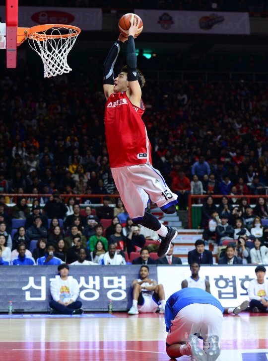 22일 부산 사직실내체육관에서 ‘2016-2017 KCC 프로농구 올스타전’이 열렸다. 덩크슛 컨테스트 결승전에 오른 김종규가 최준용의 도움으로 덩크슛을 성공시키고 있다.