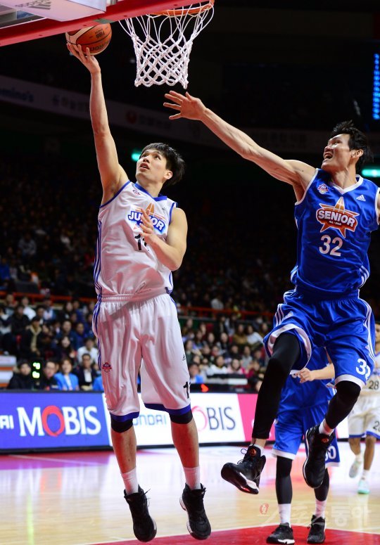 22일 부산 사직실내체육관에서 ‘2016-2017 KCC 프로농구 올스타전’이 열렸다. 주니어올스타 장재석이 시니어올스타 김주성의 수비를 피해 슛을 쏘고 있다.