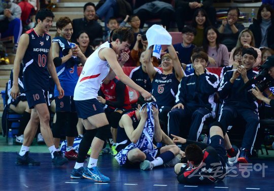 ‘NH농협 2016~2017 V리그’ 올스타전이 22일 천안유관순체육관에서 열렸다. K스타 전광인이 이상형 올스타 결승에서 문성민에 승리한 후 문성민에게 장난을 치고 있다.
