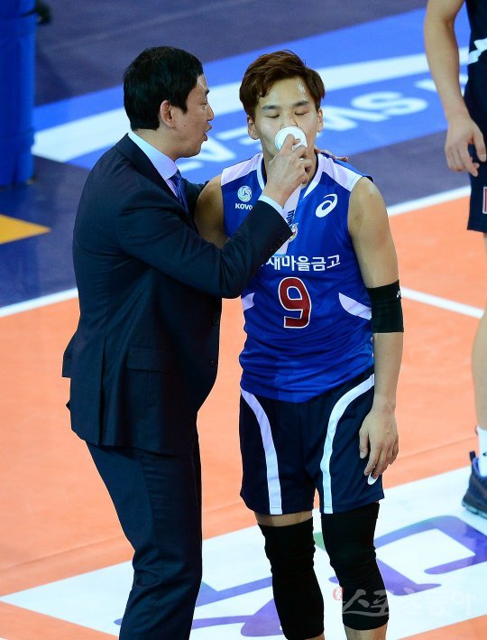 ‘NH농협 2016~2017 V리그’ 올스타전이 22일 천안유관순체육관에서 열렸다. V스타 최태웅 감독이 힘들어하는 정민수에게 산소를 공급하고 있다.