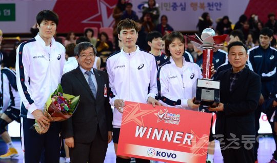 ‘NH농협 2016~2017 V리그’ 올스타전이 22일 천안유관순체육관에서 열렸다. 승리를 한 K리그 선수들이 기념촬영을 하고 있다.