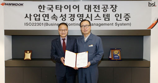 한국타이어(대표이사 서승화)가 국내 타이어 업계 최초로 ‘사업연속성 관리시스템’을 구축하며 국제표준인증인 ‘ISO22301’을 획득했다. ‘ISO22301’은 재해·사고 등 예기치 못한 위기 발생으로 업무중단 위험이 발생하더라도 빠른 시간 내에 핵심업무를 복구함으로써 기업 경영의 연속성을 유지할 수 있는 국제표준이다. 한국타이어는 글로벌 탑 타이어 기업으로의 성장을 가속화하기 위해 최고 수준의 위기관리 시스템인 ‘사업연속성 관리시스템’을 대전공장과 금산공장에 구축했다. 이는 화재나 지진, 정전 등 각종 재해나 사고 발생 시 준비된 복구전략과 매뉴얼을 따른다. 이를 통해 목표시간 내에 핵심 업무와 주요 인프라를 빠르게 복구함으로써 차질없이 소비자 및 글로벌 완성차 브랜드에 신차용 타이어 공급을 지속할 수 있는 능력을 인정받았다.