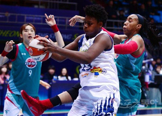 23일 인천 도원체육관에서 열린 ‘삼성생명 2016-2017 여자프로농구’ 인천 신한은행과 부천 KEB하나은행의 경기에서 신한은행 윌리엄즈가 리바운드를 잡아내고 있다.