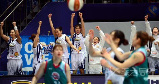 23일 인천 도원체육관에서 열린 ‘삼성생명 2016-2017 여자프로농구’ 인천 신한은행과 부천 KEB하나은행의 경기에서 신한은행이 KEB하나은행에 70-49로 승리한 뒤 선수들이 벤치에서 환호하고 있다.