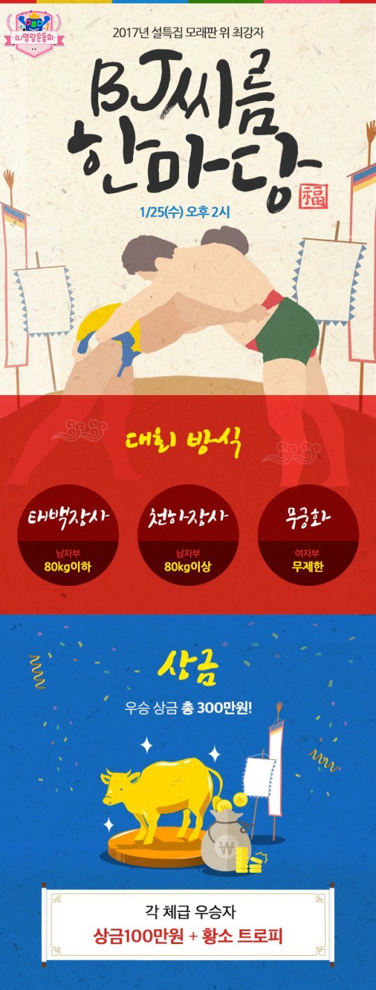 지난해 추석에 선보여 시청자들로부터 뜨거운 호응을 얻었던 BJ씨름한마당이 설을 맞아 돌아오는 것. 25일 오후 2시부터 5시30분까지 평택 이충레포츠공원 씨름전용경기장에서 열린다.