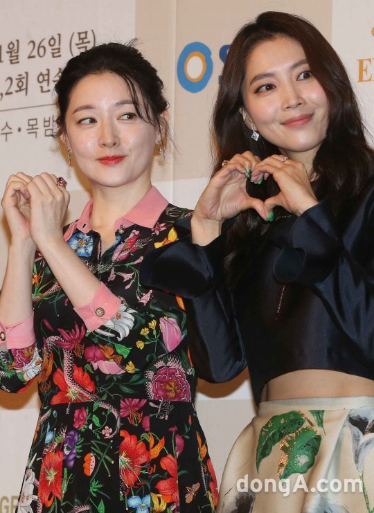 배우 이영애(왼쪽)과 오윤아가 24일 오후 서울 중구 롯데호텔에서 열린 SBS 드라마 '사임당 빛의 일기' 제작발표회에서 포토타임을 하고 있다.