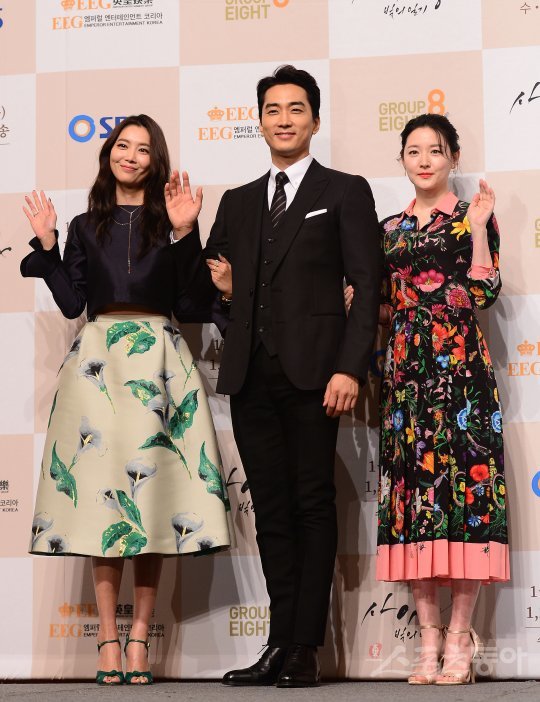 24일 서울 소공동 롯데호텔 크리스탈볼룸에서 SBS 새 수목드라마스페셜 ‘사임당, 빛의 일기’ 제작발표회가 열렸다. 배우 오윤아와 송승헌, 이영애(왼쪽부터)가 포토타임을 가지고 있다.