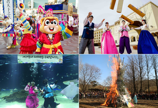 북과 전통악기 퍼레이드가 신명나는 리듬이 펼쳐지는 롯데월드의 ‘민속 한마당’, 떡메치기 체험, 제기차기 경연대회, 퓨전국악 공연 등의 프로그램을 운영하는 한화리조트 설악 소라노. 생솔가지와 대나무로 만든 달집을 태우며 새해 송액영복을 기원하는 용인 한국민속촌의‘달집태우기’, ‘설날 만원의 행복’과 포춘쿠키 경품 이벤트가 열리는 한화 아쿠아플라넷 63.(왼쪽 위부터 시계방향)