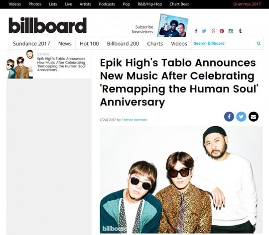 빌보드는 24일(현지시각) “타블로가 최근 자신의 SNS를 통해 새로운 음악을 준비하고 있다고 귀띔했다”며 에픽하이의 신보 소식을 전했다.
