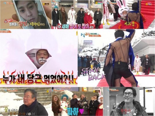 이날 쉴 새 없이 자유낙하중인 눈을 뚫고 KBS 앞에 모인 멤버들은 젊음을 득템한 김준호를 시작으로 초대박 비주얼을 뽐내 시선을 잡아 끌었다. 본 촬영에 앞서 PD에게 “설날을 맞이해서 멤버들의 설빔을 마련해 주시면 됩니다”라는 사전미션을 고지 받고 각자의 짝꿍에게 특별한 설빔을 디자인해주게 된 멤버들의 아이디어가 빛을 발한 것. 이때 차태현은 짝꿍인 김준호를 향해 “미안해. 정말 원단 값 안 들었어. 타잔 생각하면 돼. 타잔”이라고 말해 디자인을 더 궁금케 만들었다.