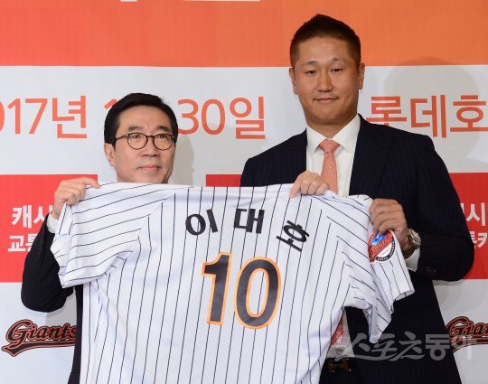 30일 서울 송파구 잠실 롯데호텔 월드에서 6년 만에 롯데 자이언츠로 컴백한 이대호의 입단식이 열렸다. 이대호가 김창락 대표이사와 함께 등번호 10번이 새겨진 유니폼을 들고 기념촬영을 하고 있다. 이대호는 지난 24일 FA 최고액인 4년 총액 150억원의 계약을 맺었다.