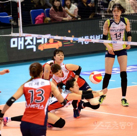31일 대전충무체육관에서 열린 ‘NH농협 2016~2017 V리그’ 여자부 현대건설과 KGC인삼공사의 경기에서 KGC인삼공사 김해란이 몸을 날려 리시브 하고 있다. 김해란은 이 날 경기에서 남녀부 통산 역대 1호 7,500 디그를 기록했다.