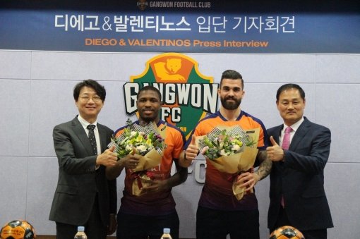 강원FC는 2일 오후 강릉 오렌지하우스 회의실에서 ‘디에고&발렌티노스 입단 기자회견’을 개최했다. 디에고와 발렌티노스와 함께 조태룡 대표이사, 최윤겸 감독이 입단식에 참석해 자리를 빛냈다. 직원들과 취재진이 회의실을 가득 채운 채 선수들의 입장을 기다렸다.
